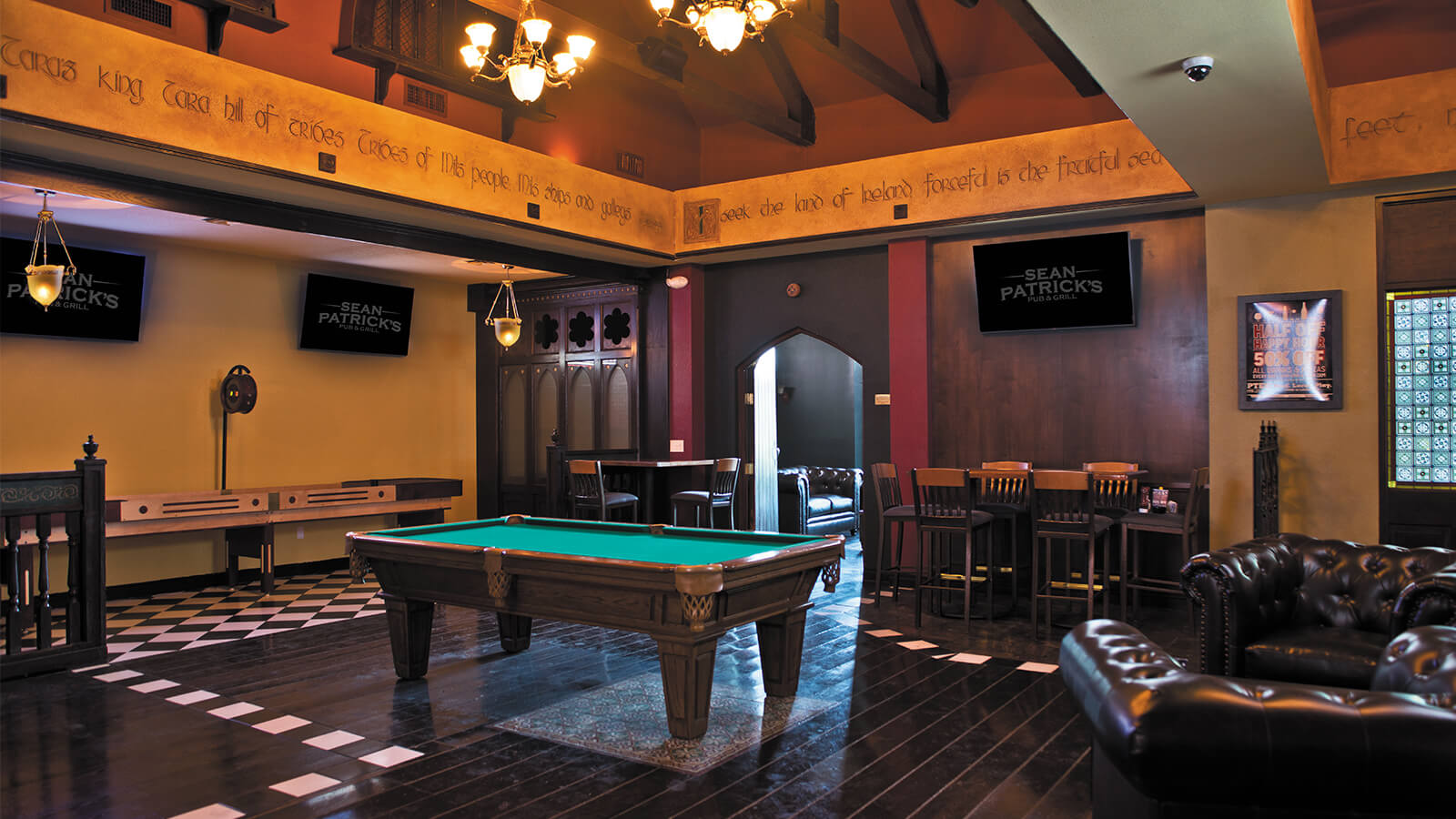 A traditional Irish pub that offers bangers and mash, pints of Guinness and plenty of gaming.